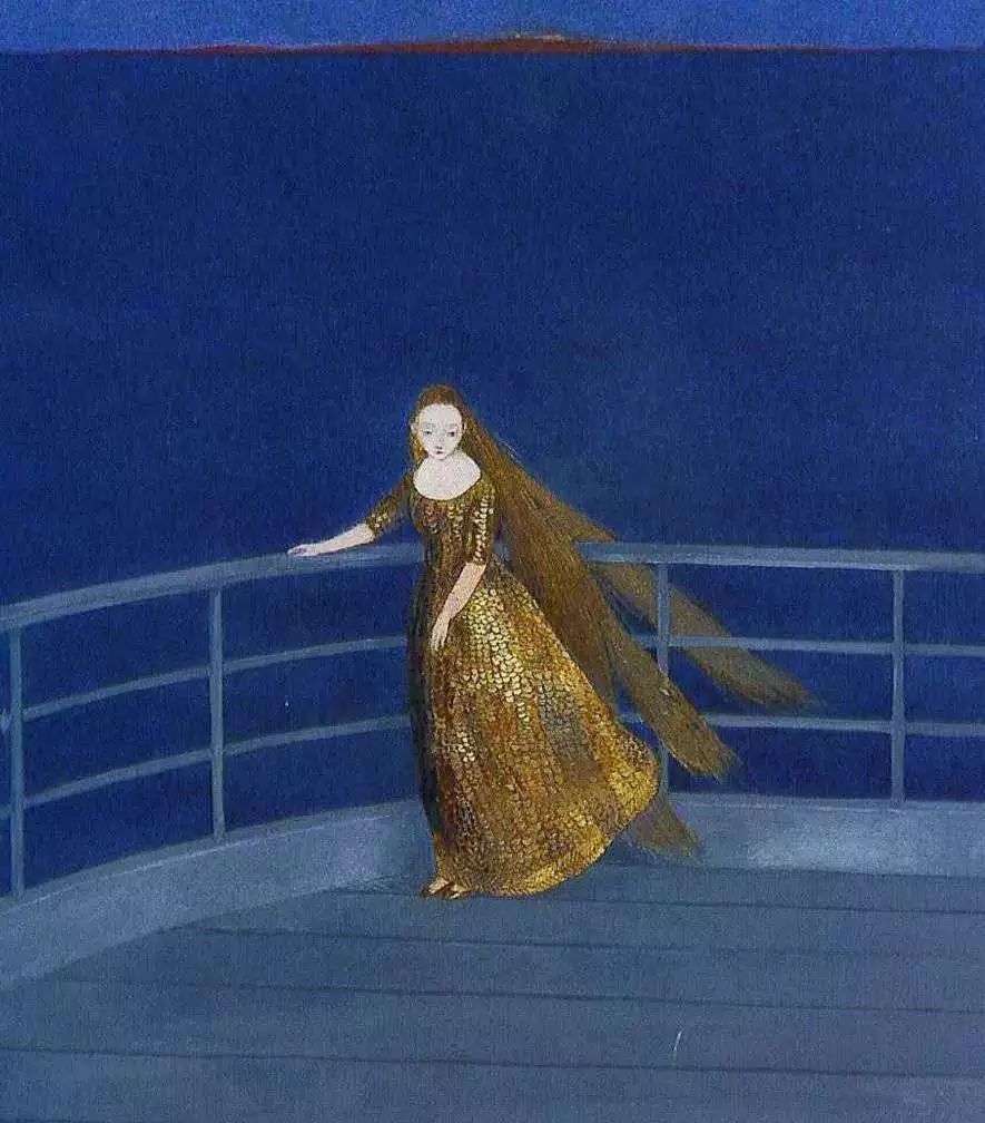 《海的女兒》中,華服上用魚鱗狀的花紋,和泛著亮光的質地,暗示了小人魚本來的身世。