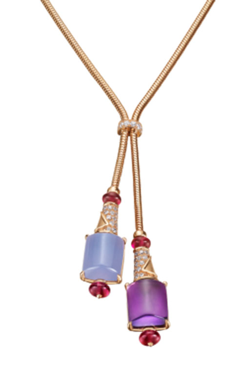DIVASDRVA系列,從項鏈、戒指、耳環到手環,都是以簡單白黑扇形,金色的吊鏈上鑲嵌著寶石,造型奇特又大膽,備受皇家貴族跟影視明星的青睞無不體現女性魅力的精髓。