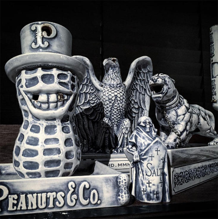 在1947到1952年之間,所有的人造商品都被稱為或標(biāo)記上“占領(lǐng)區(qū)制造 / 日本占領(lǐng)區(qū)制造”的標(biāo)簽,很多高品質(zhì)的產(chǎn)品都是專為海外生產(chǎn),或被用于銷往海外 在這些瓷器當(dāng)中,有些并非日本人設(shè)計的海外出口品,包括骷髏頭、惡魔等設(shè)計,它們現(xiàn)在都成為復(fù)古玩家的心頭好。從這段歷史中我獲得了靈感,因此開始推出日本制的香爐。