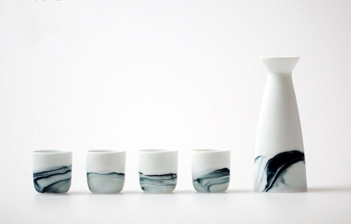 一般這些陶瓷品牌總少不了茶具套裝,而山水間的水墨酒套裝使整個品牌更加出色。這款茶具的特點就是外面潑墨似的上釉。一套放在一起像一幅山水畫,滿是禪意,用它品酒才是真享受。