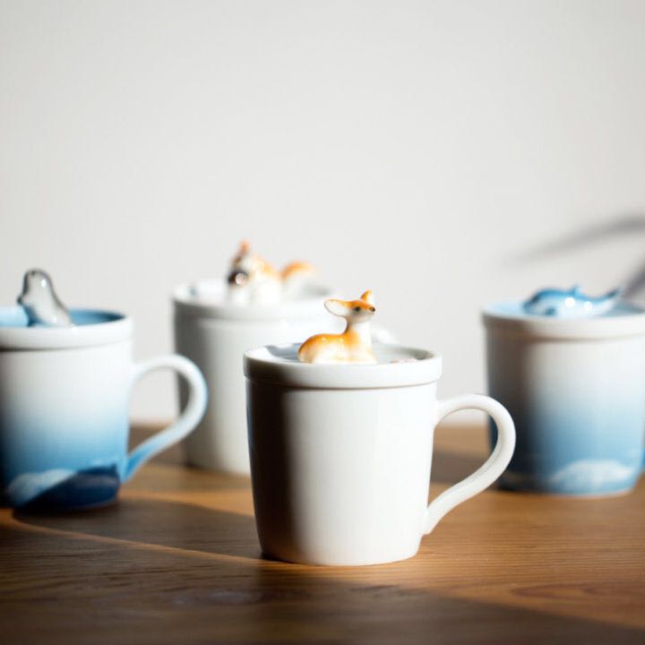 市場上往往會銷售的帶有動物元素的杯子總是會將元素印在杯壁上,而山水間的這款動物手繪杯卻是將元素放在了杯蓋上,其動物元素有小鹿、海豚、狗狗等,而所上的顏色既不顯得幼稚,也不顯得廉價,竟使那動物也帶上了山水間獨有的仙氣,栩栩如生,如磨如琢。且每一個杯子造型都很精致,杯蓋上的小動物都是工匠們親手捏出來的,仿佛做出來的杯子都充滿靈氣。