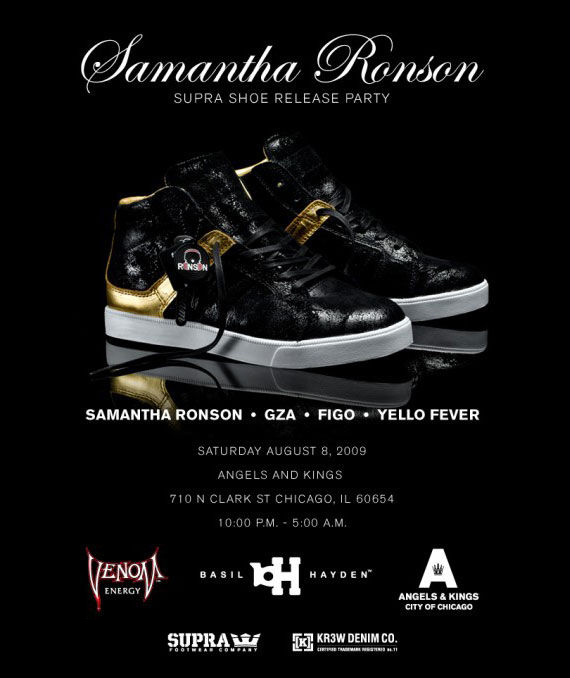 2009年,supra發布秋季系列——別注版Supra Indy,這款鞋由著名的DJ兼歌曲創作人、并且還是格萊美大獎獲得者的薩曼莎·羅森參與設計。這款鞋最引人注目的特征,是鞋面以古磨舊化的黑色皮革打造,并點綴金色皮革,其整體呈現出重金屬感,富有音樂元素。