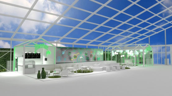 整個創意空間以綠白色調為主,頂部采用白色框架結構,并懸掛以形狀不一的浮云,與平鋪陳列的同色系吧臺遙相呼應,搭配以Perrier標志小綠瓶,法國標志性建筑埃菲爾鐵塔,cocktail,充滿奇思妙趣的藝術元素完美詮釋了Perrier品牌設計感,也無時無刻不在激發藝術創想,靈感仿佛能隨著Perrier的氣泡一樣迸發!