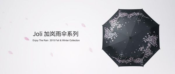 2015年11月,BANANA UNDER隆重推出Joli系列雨傘,該系列采用全新的設計理念。其傘面采用高密度NC布以及杜邦超強防潑水涂層處理,并且重新設計了對抗風雨的傘架結構。此款傘的設計靈感來自于櫻花,“落櫻滿懷-抬頭看櫻花那一瞬間,心輕輕顫動,全世界都變得溫柔起來,這樣心動的一刻,蕉下為你凝結”,宣傳語搭配上灑落在黑色傘面的櫻花花瓣,是整個畫面感大大加分。全黑的外傘面中一簇簇櫻花花瓣,在烈日炎炎之下,更加凸顯櫻花的粉色,仿佛置身于櫻花樹下。