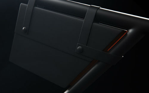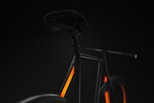 從自行車一側,我們只能看到它的啞光黑框架,只有在特定的角度才能發現隱藏起來的亮色。同系列設計的還有一款背包,與自行車相同,從頂端看為全黑,換個角度能看到其中明亮的黃色。其logo還有系列定制字體也演繹著同樣的風格,保證整體的統一。