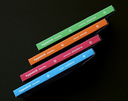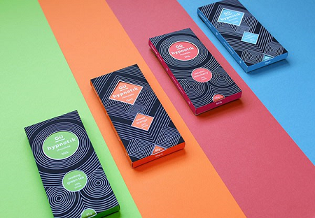 Hypnotik Chocolate 具有簡約大方的外形、顏色鮮艷的包裝。每一種顏色和圖案都準確的描述了它的口味和特點。
