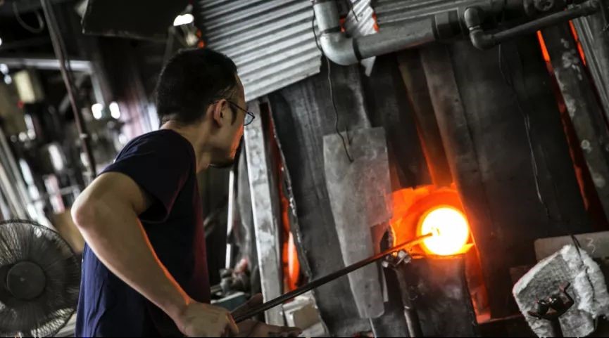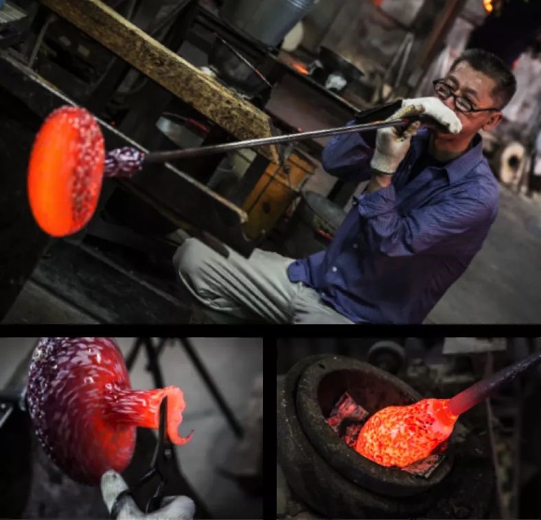 所謂熱加工,是將硅石粉、酸化鉛等主輔料調(diào)配稱量后,進(jìn)行約30分鐘的攪拌混合,投入窯爐進(jìn)行1500度以上的高溫?zé)?,待到熔成無(wú)氣泡雜質(zhì)的干凈硝子后,降溫至1100度左右,柔軟狀態(tài)下的硝子就可以用不銹鋼制吹桿取出吹制。經(jīng)由吹桿吹制加工的硝子原料,邊旋轉(zhuǎn)邊在空氣中冷卻。