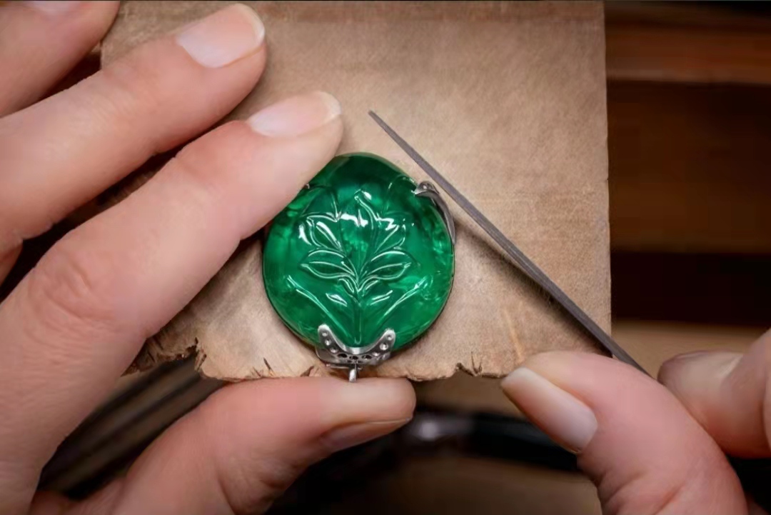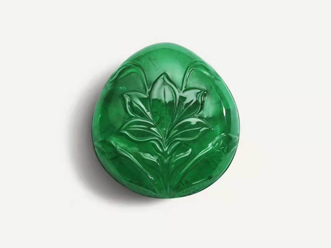 Jubilee Emerald Garden高級珠寶作品堪稱凝聚匠心工藝的典范力作,由一位金匠大師攜手一支五人的團隊耗時逾1500個小時傾力打造,其中兩名工匠專門負責手工寶石鑲嵌。該作品采用鉑金材質制成,并鑲嵌祖母綠和鉆石,呼應慶祝英國女王鉑金禧年這一主旨。這款高級珠寶從花束造型中擷取靈感,呈現新穎別致的設計風格。所鑲嵌的一顆重約63.44克拉的贊比亞祖母綠閃爍著迷人光芒,堪稱點睛之筆。祖母綠上面還雕刻有一朵盛開的蓮花,進一步襯托出這顆寶石的驚艷脫俗。