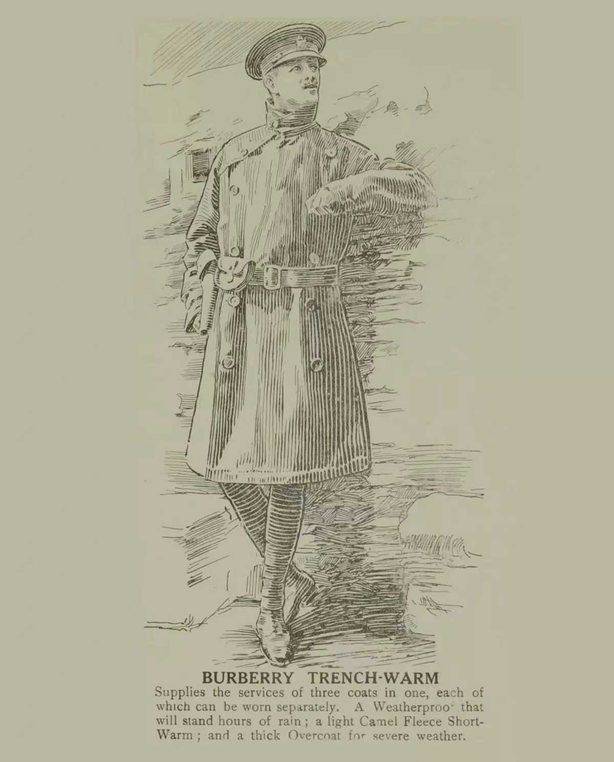 2)布料/品牌特色 Burberry在1879年發明了革新性的防風雨型嘎巴甸 面料,它還有另外一個中文名,大家會比較熟悉: 華達呢。該棉質面料不僅具有防滲雨功能、實用耐穿,而且質地透氣輕便。它的組織是2/2 右斜紋(所謂組織就是指織布的織法), 斜紋角度比較陡斜,約63度,其織物表面呈現陡急的斜條紋讓破重不堪的雨具煥然一新