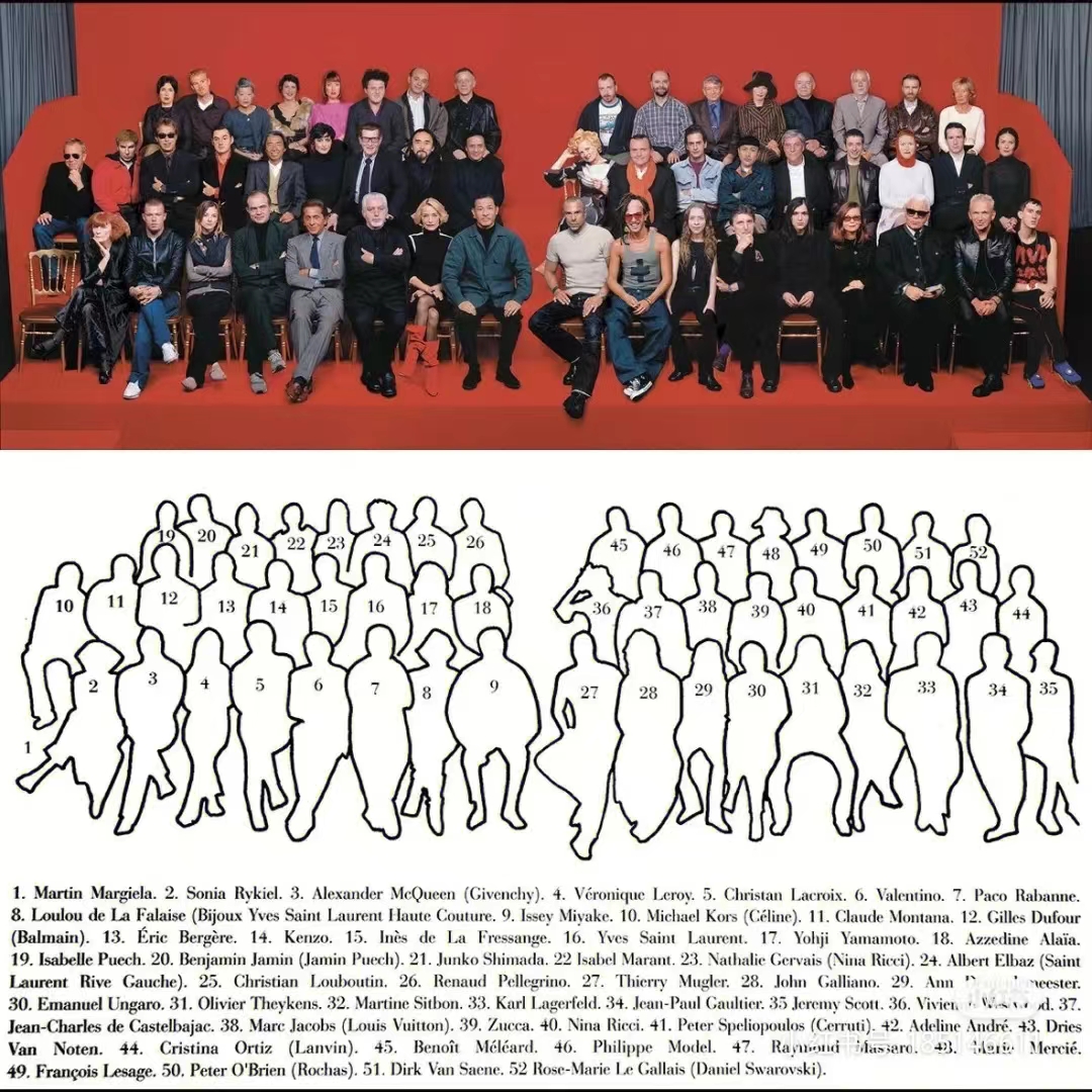 1998年,法國攝影師Jean Marie Perrier在法國版《ELLE》50周年之際為這52位時裝界最具代表性與影響力的頂級時裝設計師拍下了這張”世紀大合影”。然而在照片的最左下角,在Sonia Rykiel的左邊有一張空椅,這是為Martin Margiela特地留的座位。