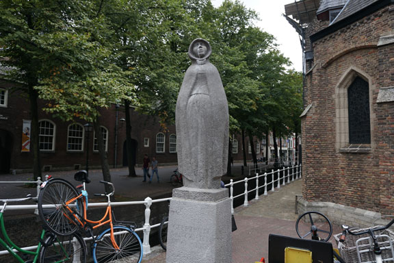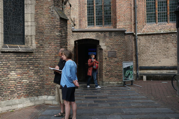 代爾夫特老教堂內有一塊弗米爾的墓碑(圖4.)。這是許多游客來代爾夫特最重要的目的地之一。墓碑底下就是弗米爾的尸骨。教堂的左側有一個小門(圖5),從這里才能進入到老教堂里面。門口有一個雕塑(圖6.),非常有特色。