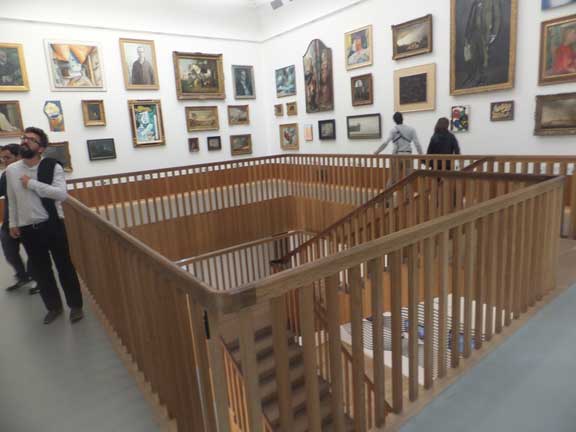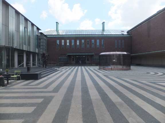 荷蘭的很多博物館有專門的寄存服務,并且分為專職工作人員和自助兩種類型。國立博物館的寄存服務工作人員最多,并且還有很多自助存包柜。但是,川流不息的游客還是讓工作人員忙的一塌糊涂。博寧恩博物館的寄存業務完全是自助的。寄存柜和懸掛衣服的設計非常棒(圖2.),還獲了荷蘭的一個什么獎。游客可以把行李箱和背包放到用繩子編織的寄存柜里。看完展覽之后來取行李的時候,一眼就能看到自己的東西。另外,把衣服放在衣撐上,拉到高處,讓人拿不到。然后把繩子鎖住,把鑰匙拔下來,就可以去看展覽了。博寧恩博物館展出的現當代藝術比較多(圖3.)。除了赫里特·道的《江湖騙子》之外,還有薩恩列達姆的《教堂內景》。另外還有《股票市場》、《醫生給婦女看病》等著名的作品。魯本斯、倫勃朗的作品在這里也有不少。另外,還有很多設計作品,就是日常生活器具、椅子什么的。還有現當代作品,如裝置藝術、行為藝術。所以,博寧恩博物館是傳統藝術與現當代藝術并存的博物館。