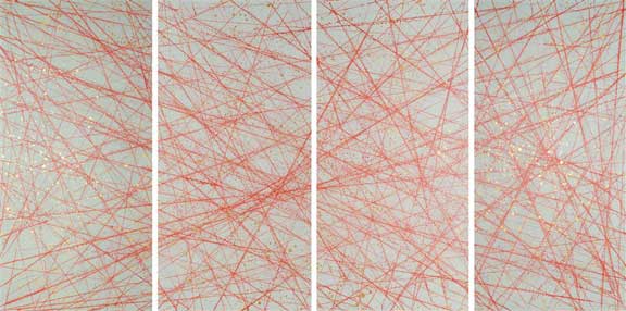 策展人桑弗先生總是喜歡拿潘魯生與抽象表現主義藝術家杰克遜·波洛克作比較,雖然他們的創作手法和過程有相似之處,但準確地說,潘魯生的“抽象”并不等同于杰克遜·波洛克的抽象。因為杰克遜·波洛克強調的是“即興和隨意的行動”,而潘魯生雖然也會使用滴、灑等手段,但他的“抽象”被賦予某種特殊含義和文學意味,用中國傳統文藝理論的一個概念“意象”來命名似乎更為恰當。比如潘魯生使用鋁塑板和丙烯顏料創作的“神山悟道”系列,就是典型的“詩化物象”。再比如“魯班繩度”系列,相對于使用墨斗“彈”的行動和最終所呈現的抽象線條,其意義更在于這二者結合所傳達的觀念性內涵。