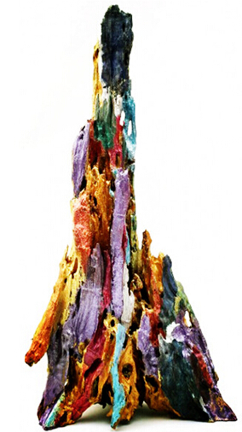 本次《Tea or Coffee》展,給我們呈現(xiàn)的便是王清州近年用雕塑所表達(dá)的一種自然性的意象之美。初見這些雕塑,我們會跳出這樣的字眼:“大樸不雕”、“鬼斧神工”。是的,與既有的機(jī)械化、工藝化、工程化的大多數(shù)雕塑作品不同,王清州的雕塑作品給人一種“天然”的假象。這些石頭、木頭上,似乎看不出明顯的人工痕跡,似乎不是因?yàn)槿说男枰嬖冢膊皇菫榱藙?chuàng)造而創(chuàng)造。這正是王清州創(chuàng)作的意圖所在。取材天然,隨形雕琢、設(shè)色,一切都是遵循自然規(guī)律來創(chuàng)作,不是想當(dāng)然,而是自然而然,在“渾然天成”里激發(fā)出作品本身潛藏的靈性、詩性,又飽含抒情意味。這種與工業(yè)社會、當(dāng)代藝術(shù)風(fēng)氣截然相反,又帶有對技術(shù)主義、消費(fèi)主義現(xiàn)實(shí)批判的創(chuàng)作方式,讓我們回到了“道”,這一元初又亙古澄明的世界。王清州也是借用這樣一種方式,表達(dá)了他對當(dāng)下文化、自然、社會以及人類發(fā)展本身的叩問。