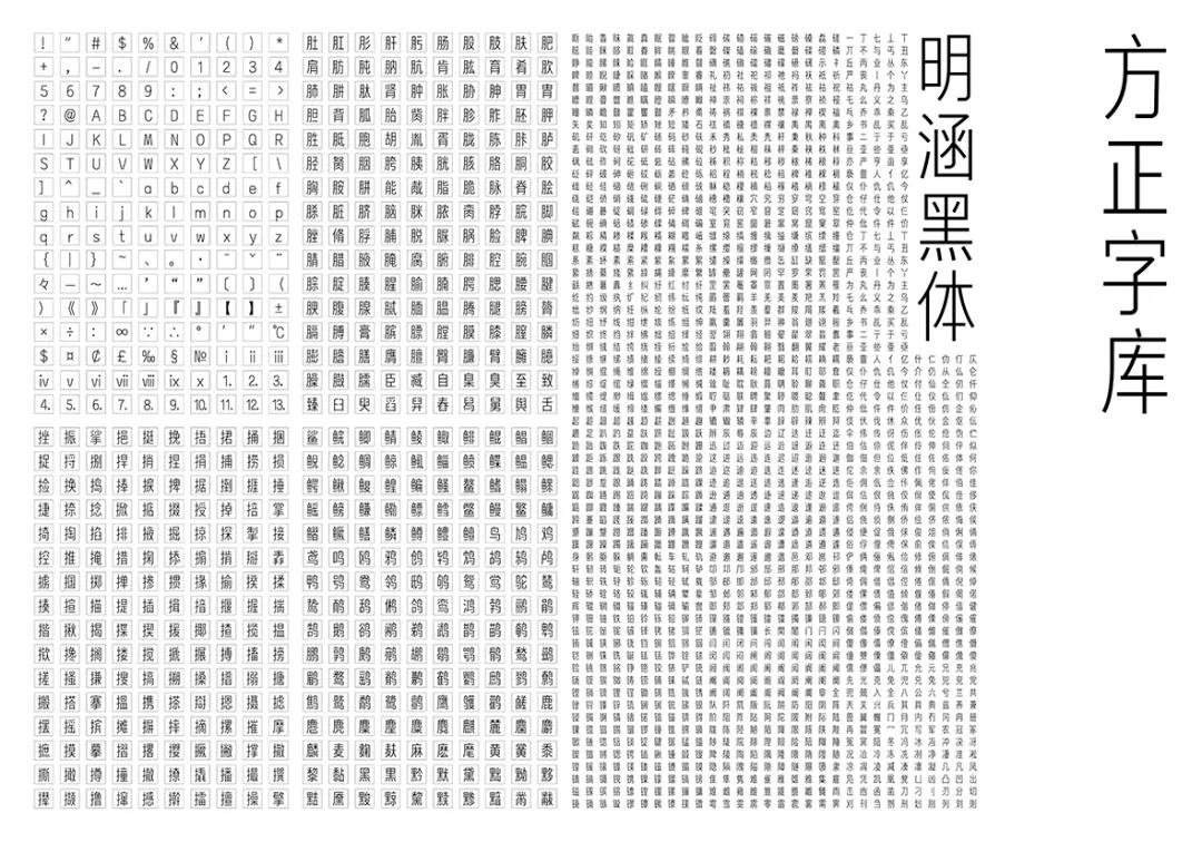 明涵黑體字庫字體包含GB2312-80(即國際簡體漢字(6763 個)、另有660個網絡常用字,共計7400余個漢字字符。此外,數字、拉丁、日文假名、特殊符號等常用字母符號約200余個。