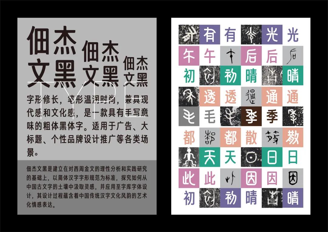 佃杰文黑是建立在對西周金文的理性分析和實踐研究的基礎上,以簡體漢字字形規范為標準,探究如何從中國古文字的土壤中汲取靈感,并應用至字庫字體設計,其設計過程蘊含著中國傳統漢字文化風韻的藝術化情感表達。